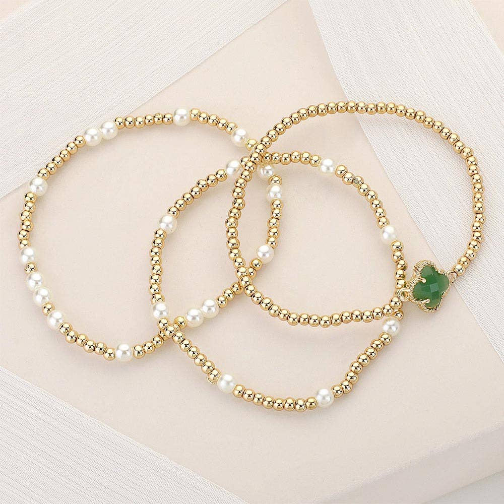 3PCS - Quatrefoil Pointed Pearl Metal Ball Beaded Stretch Multi Layered Bracelets