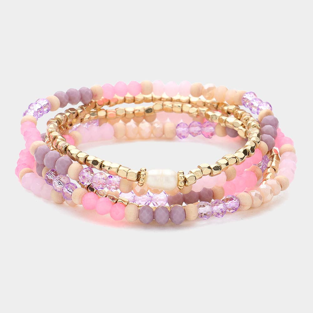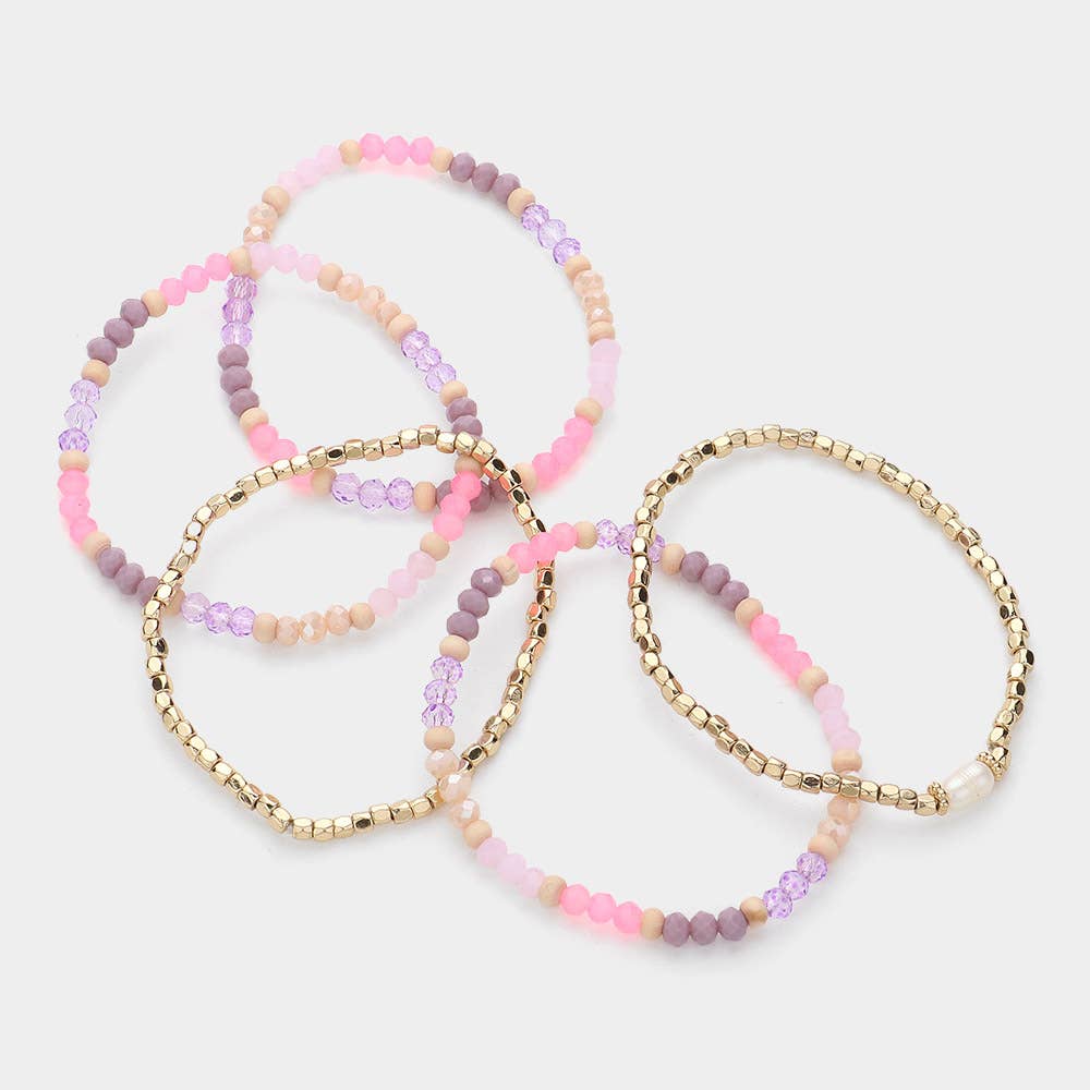 5PCS - Metal Cube Wood Ball Faceted Beaded Stretch Bracelets