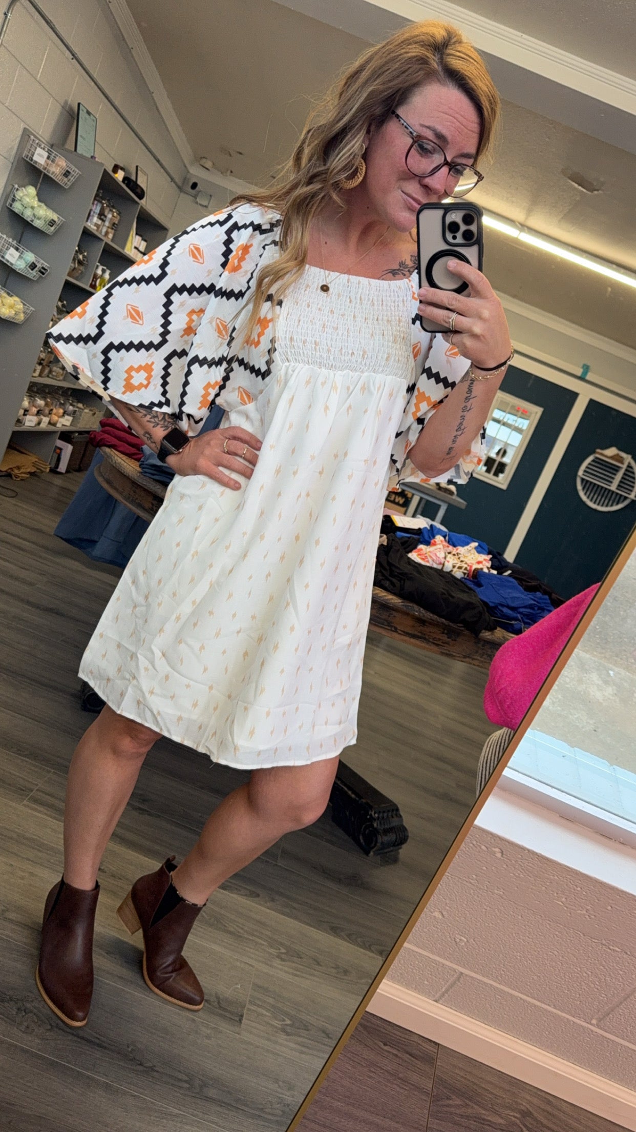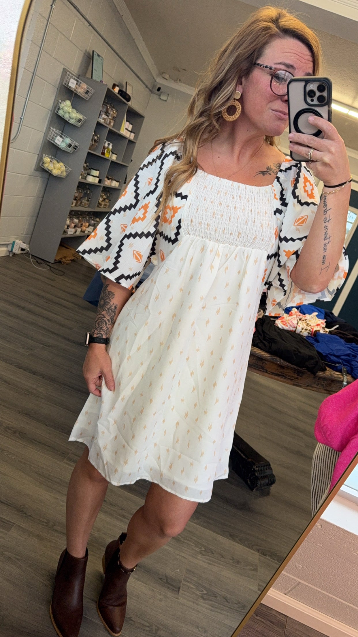 Aztec Print Pleated Square Neck Loose Mini Dress