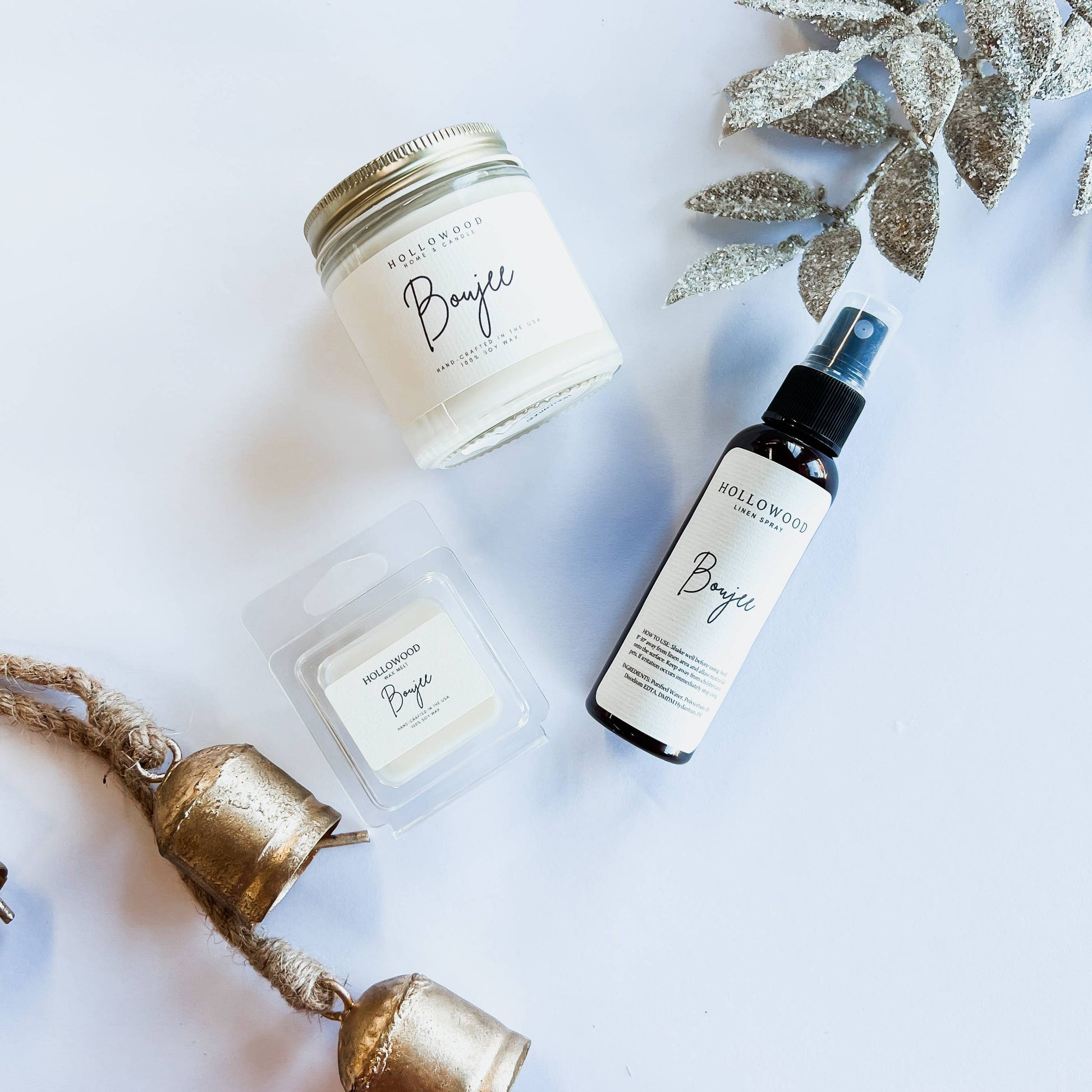 Look no further than our Boujee Holiday Gift Set! This quirky set includes a 4-ounce candle, 2-ounce linen spray, and 1-ounce wax melt, making it a great choice for gift giving or stocking stuffers. Give the gift of relaxation this holiday season with our Boujee set.