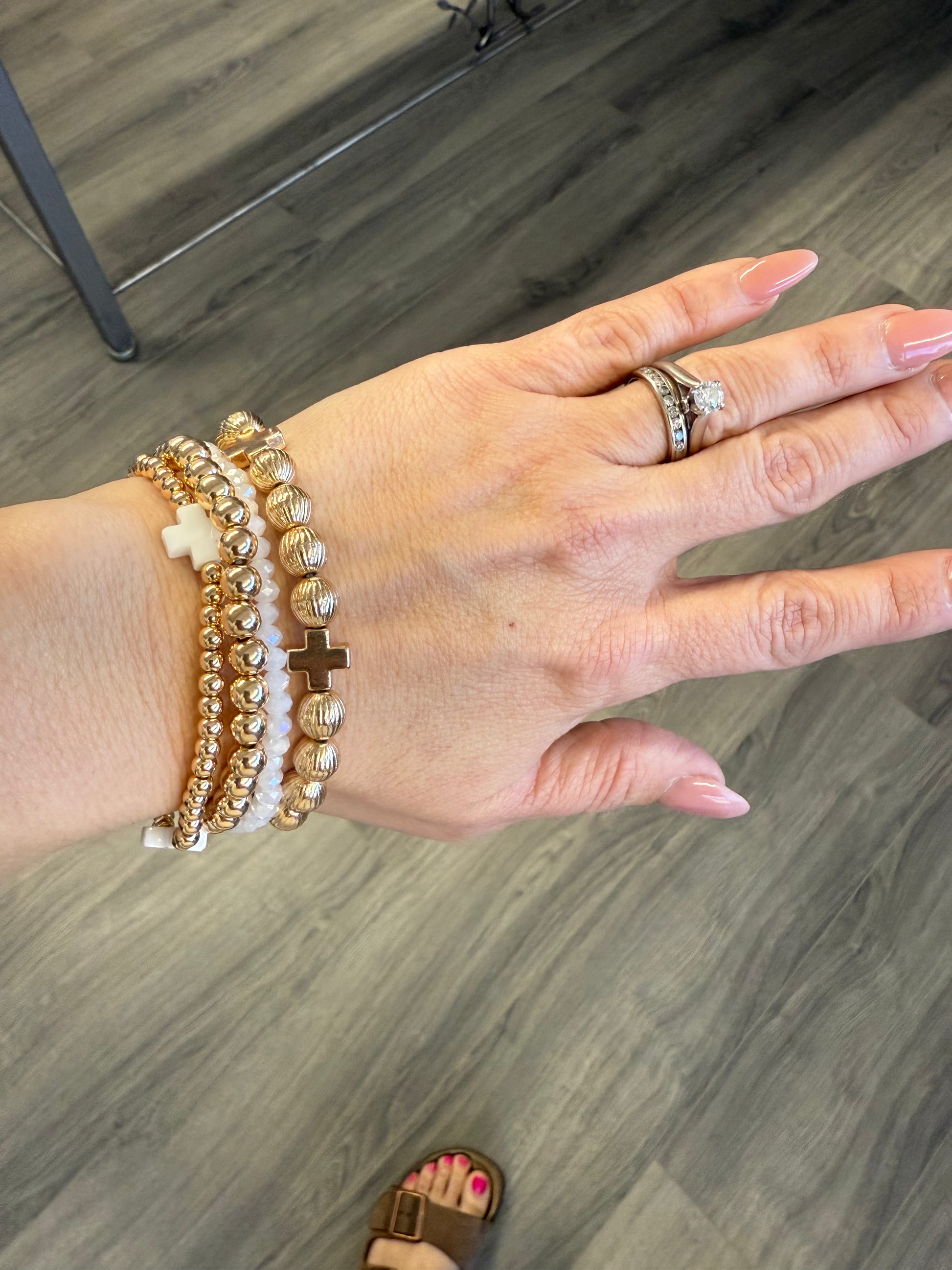 Cute stacked crossed bracelets. White or pink cross design. Bracelets are water-resistant.