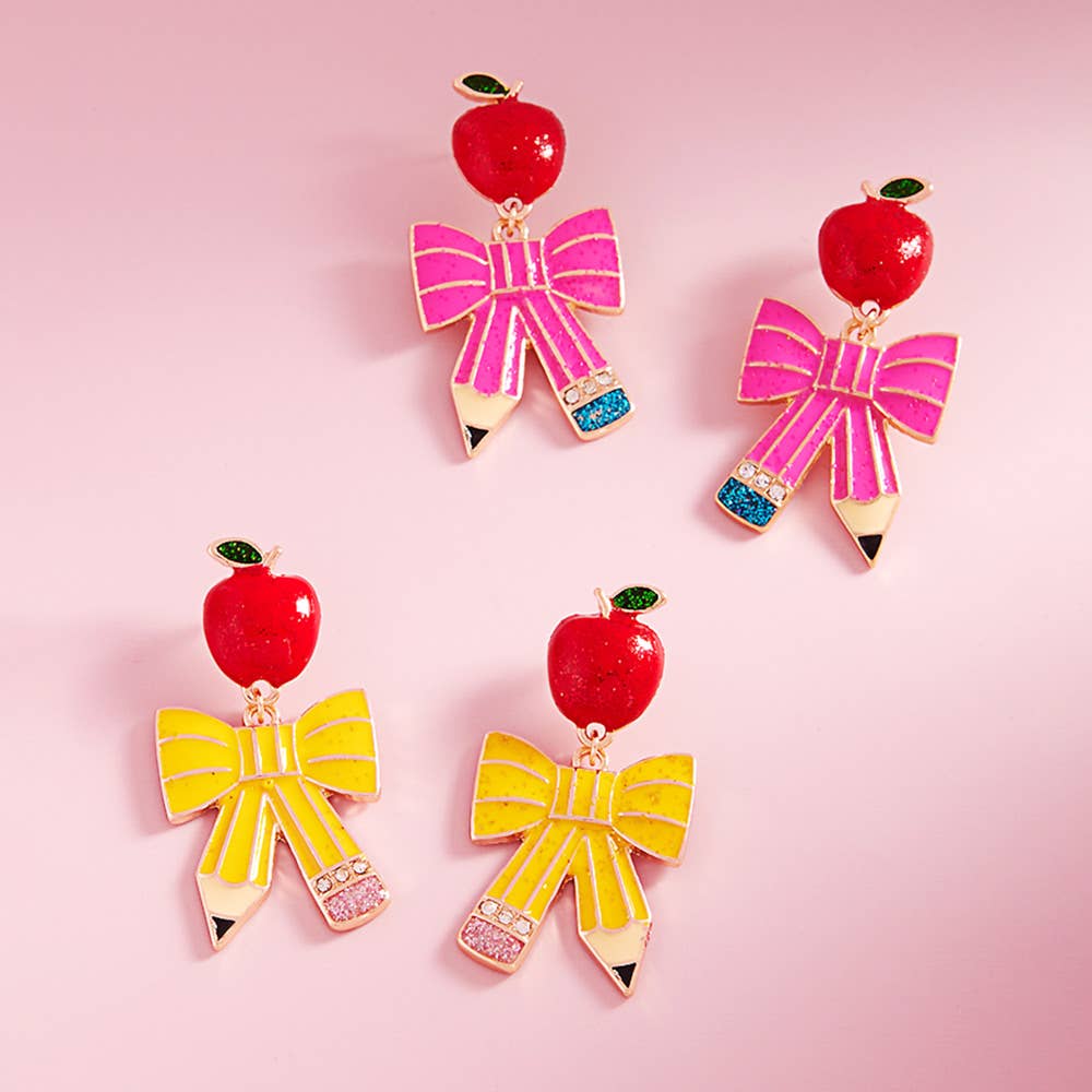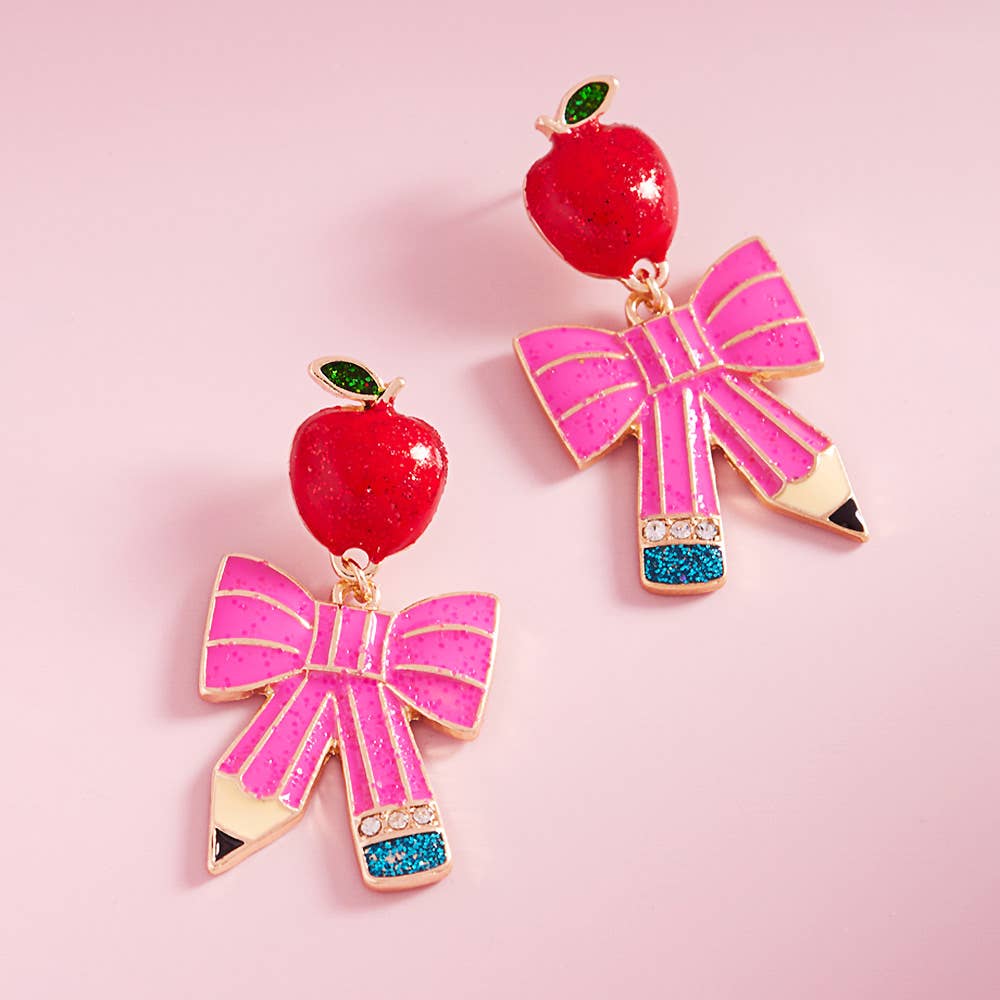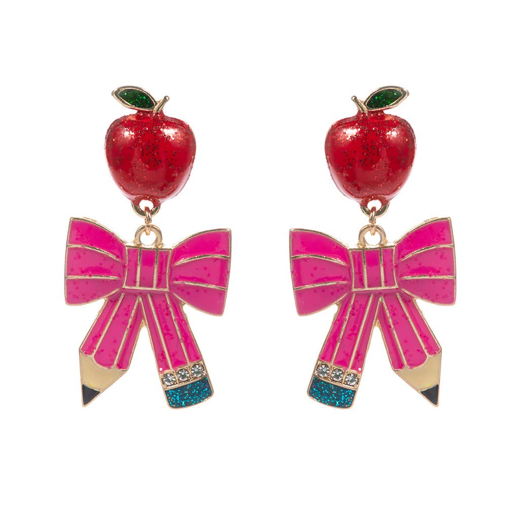 Enamel Apple Bow Pencil Dangle Earrings • Size : 0.8" X 1.75" • Titanium Post Back • Hypoallergenic • Lead and Nickel Compliant