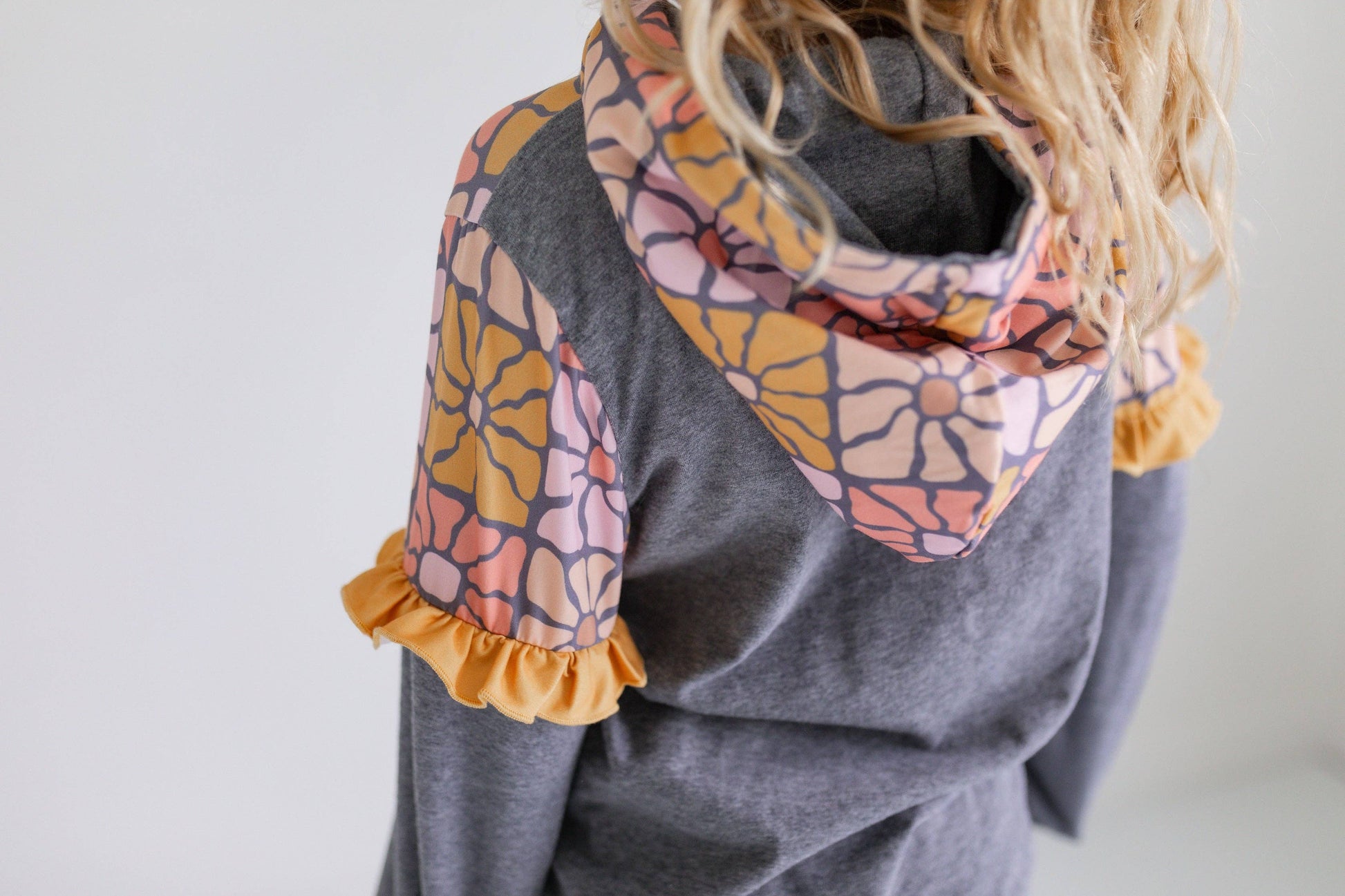 Girls two piece set includes Gray, Mustard & Pink floral print ruffle hooded top with mustard ruffle trim. Gray sweat pant lounge pants with mustard ruffle trim.