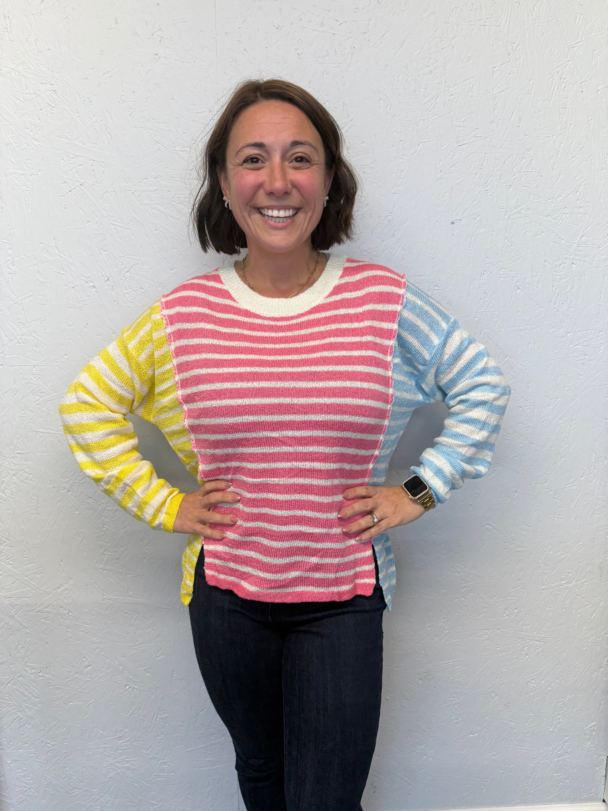 ย ๐งถ Stylish color block stripes catch the eye. ๐ Loose fit ensures comfy, chic wear.