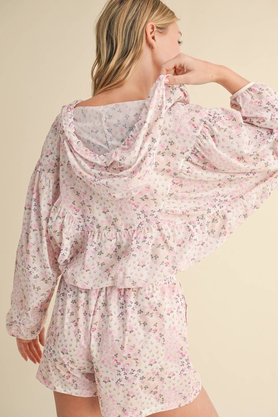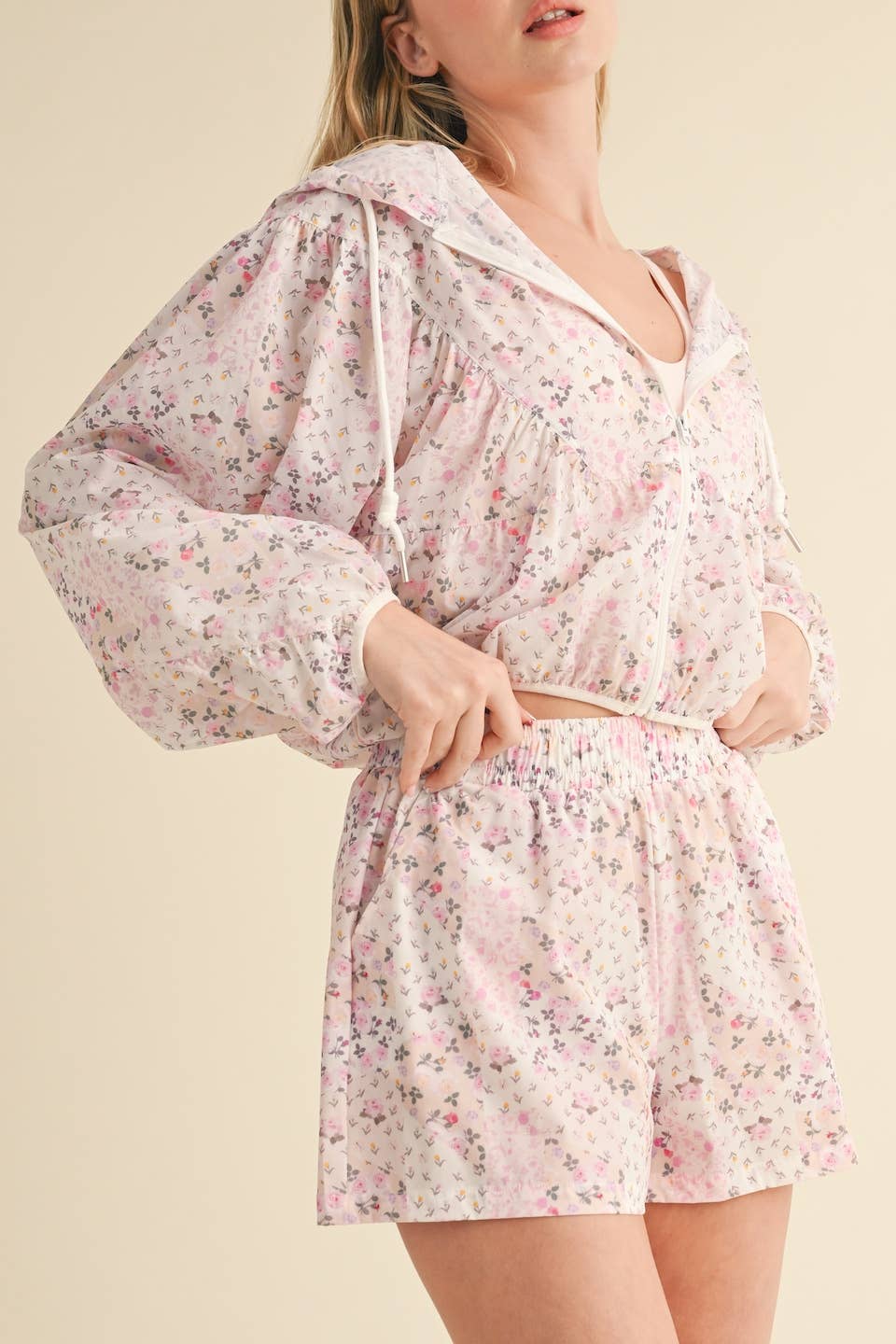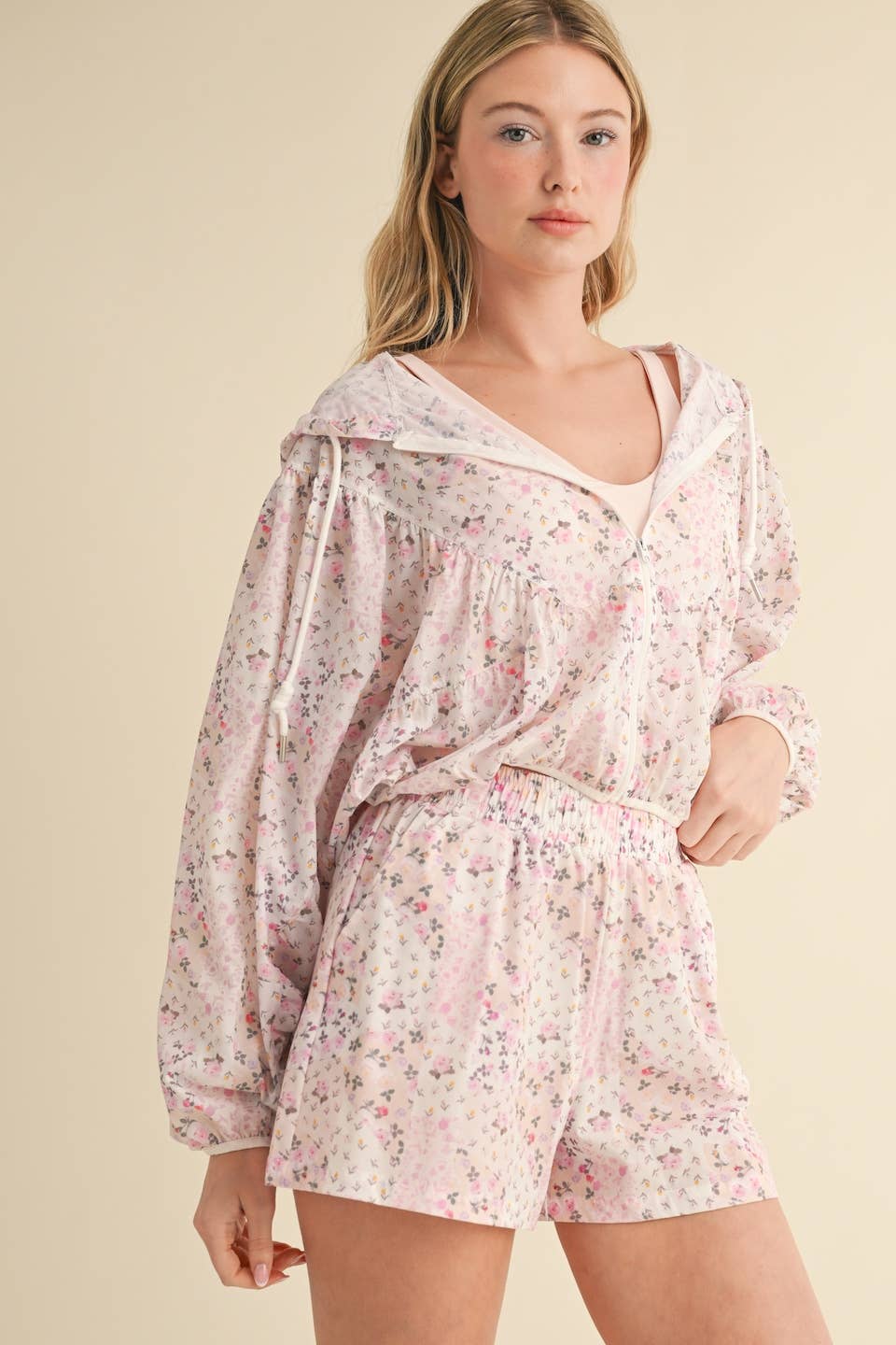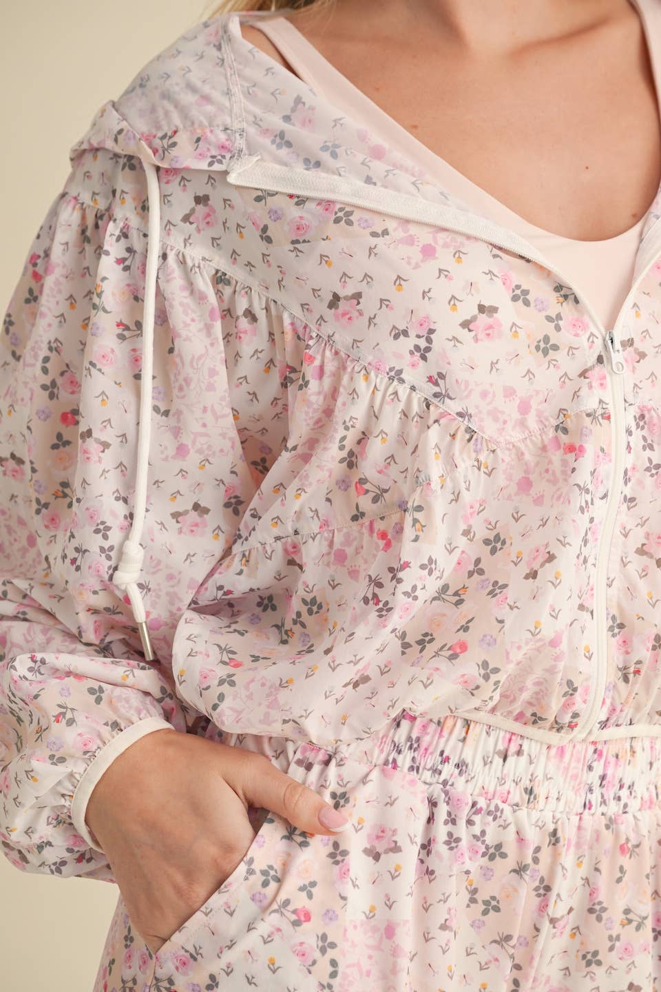 Lightweight windbreaker jacket in patchwork print. Full zip and adjustable drawstring.