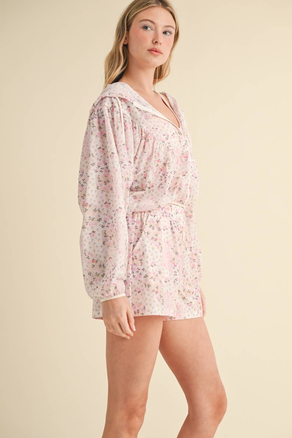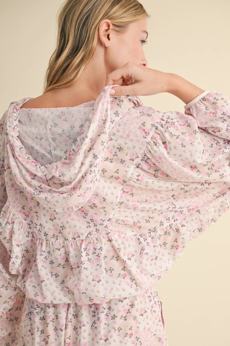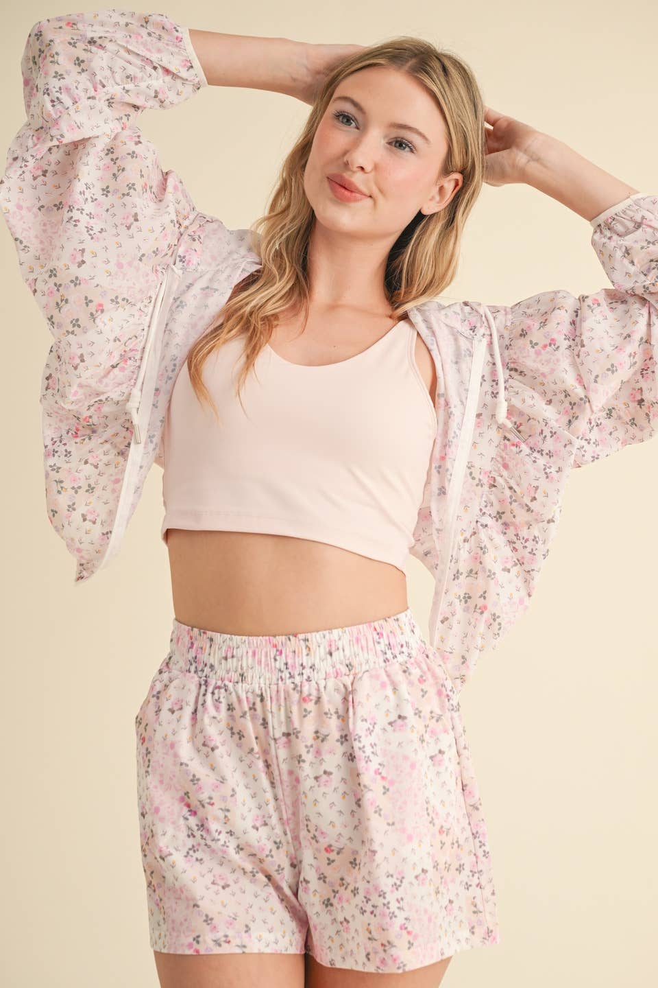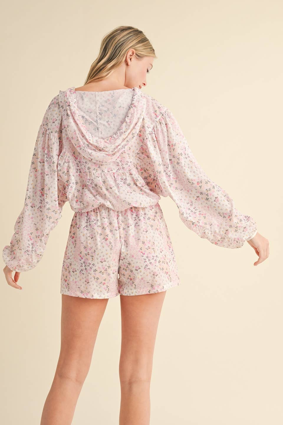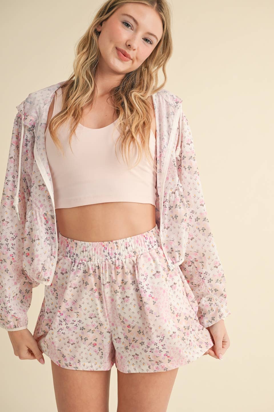 Lightweight windbreaker jacket in patchwork print. Full zip and adjustable drawstring.