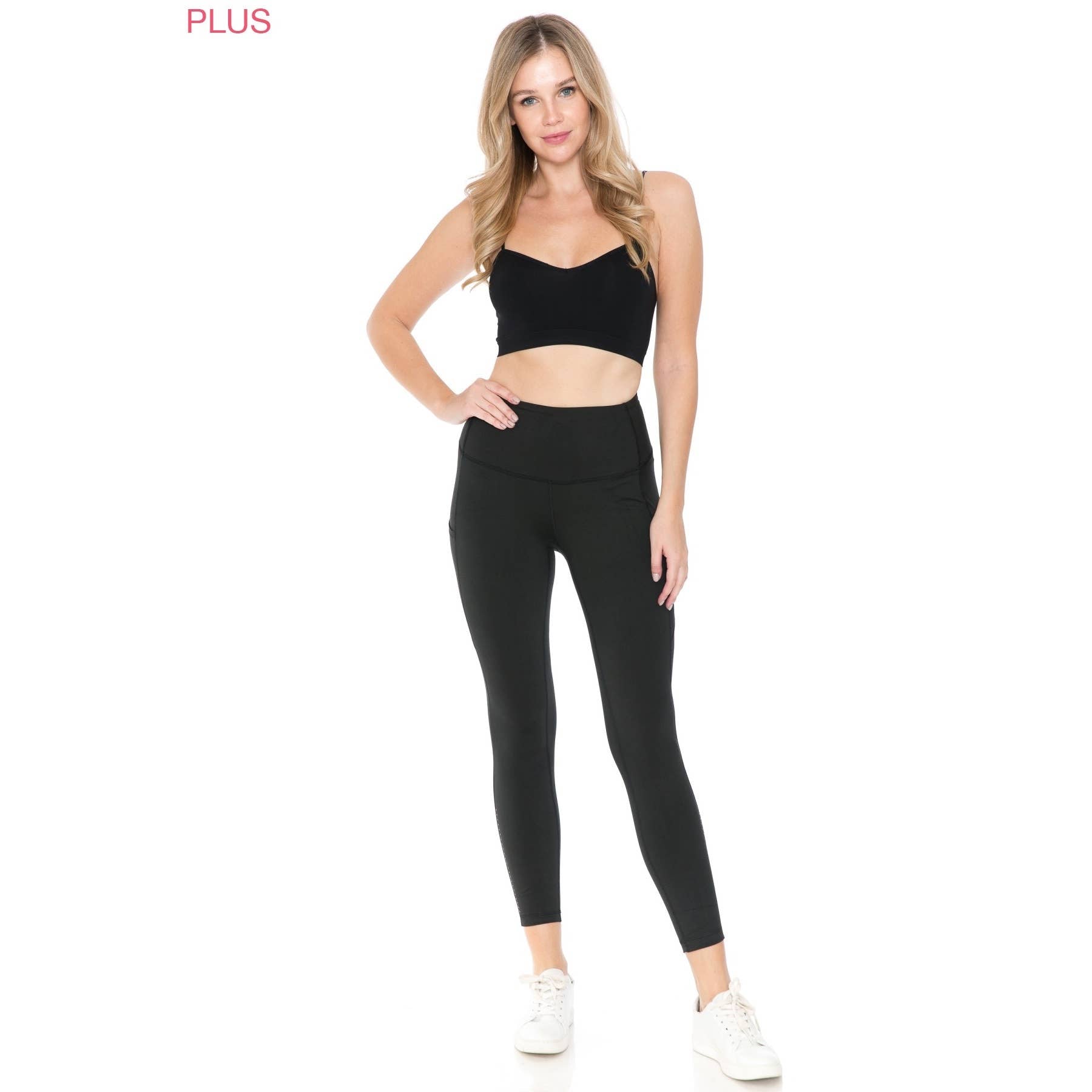 Plus size premium 5-inch activewear high waist solid leggings with flatlock stitching, side pockets & reflective dots.