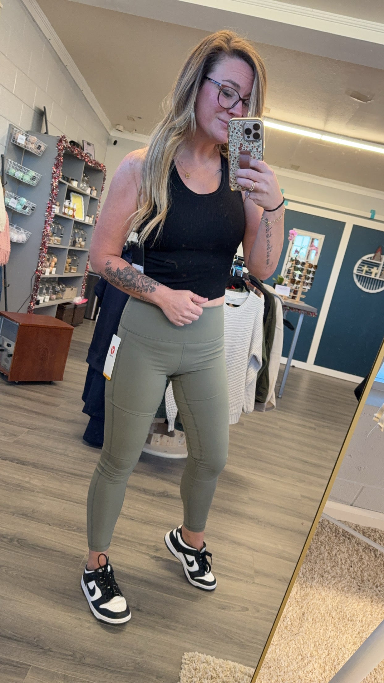 Pocket in waistband and side. 28" inseam full length activewear leggings.