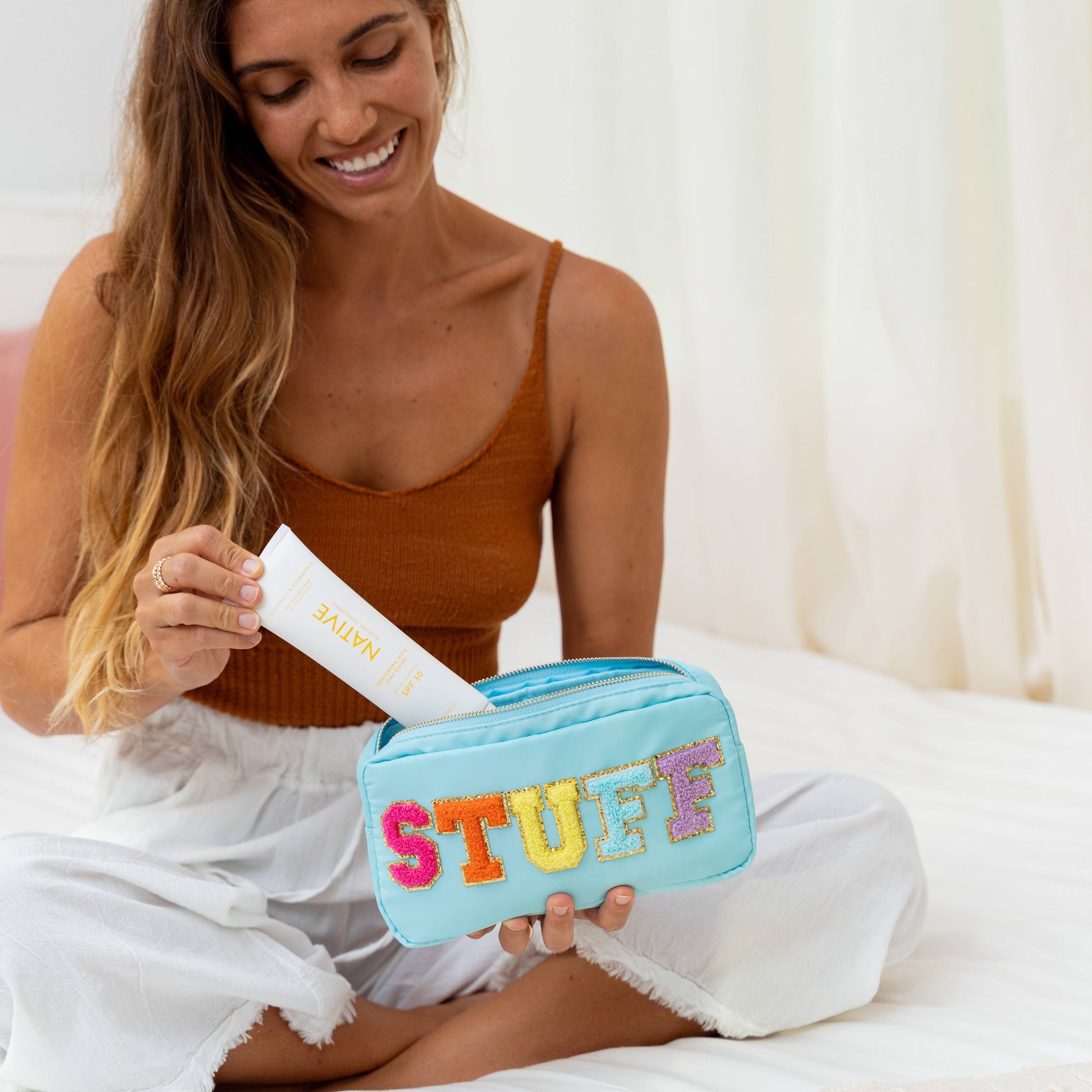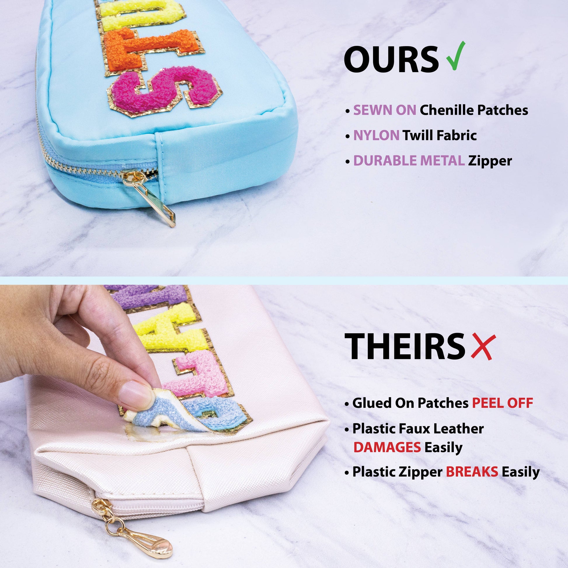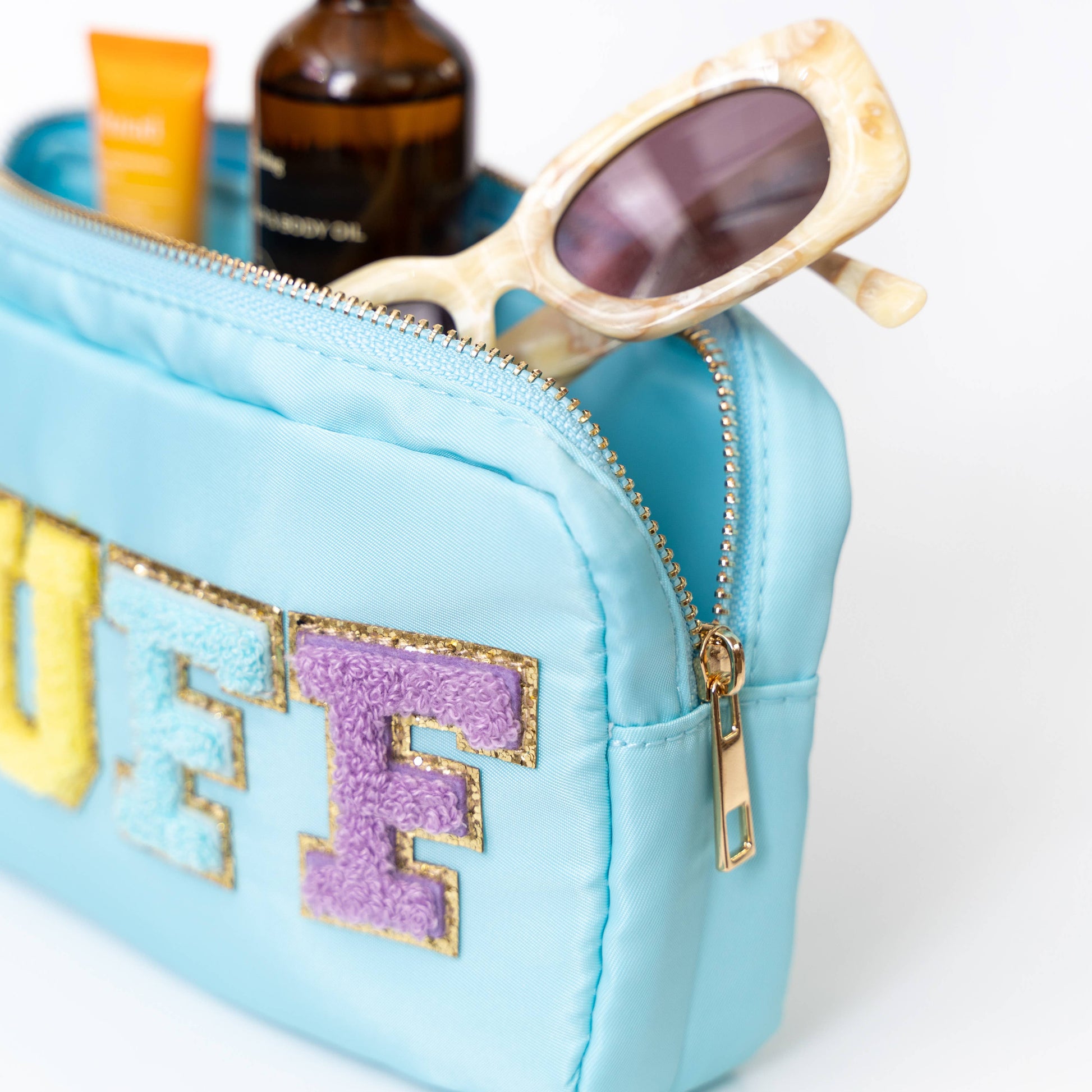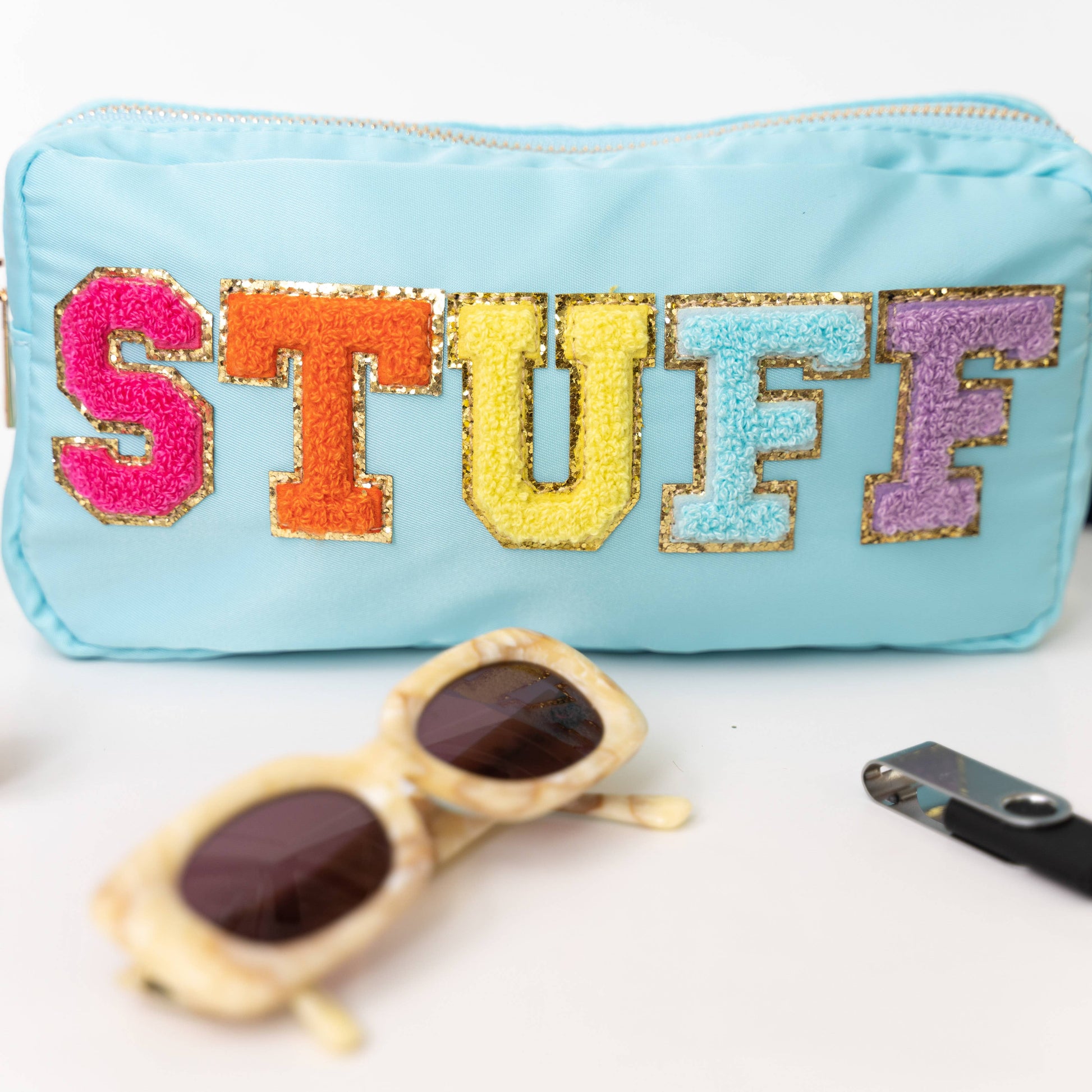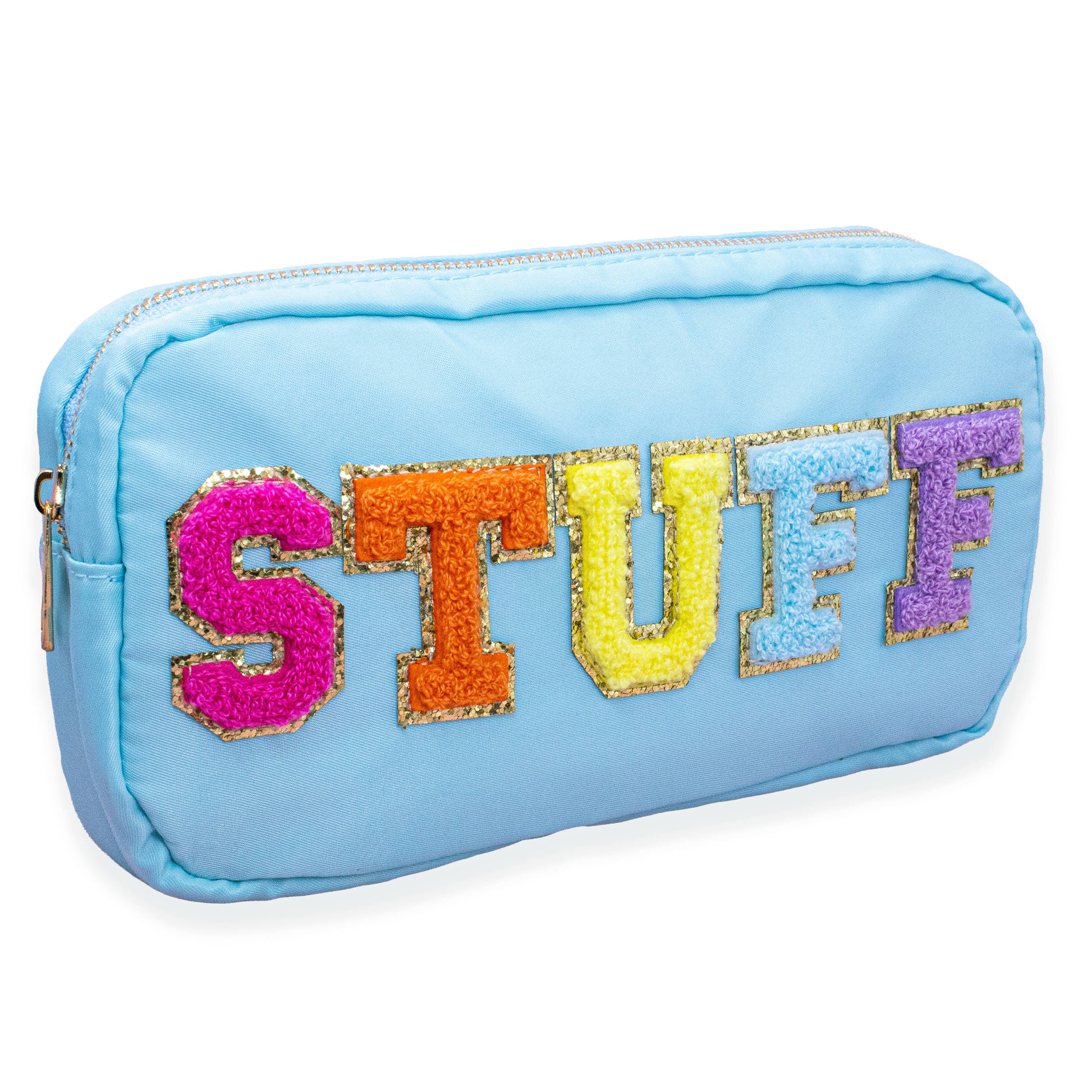 * Travel sized chenille letter patch bag * UNIT= PC * Made with water-repelling white nylon twill fabric * Rainbow chenille varsity letter patches that are sewn onto the bag * Gold metal zipper * Size - 9" x 5" x 2" * Style - Aqua blue STUFF *