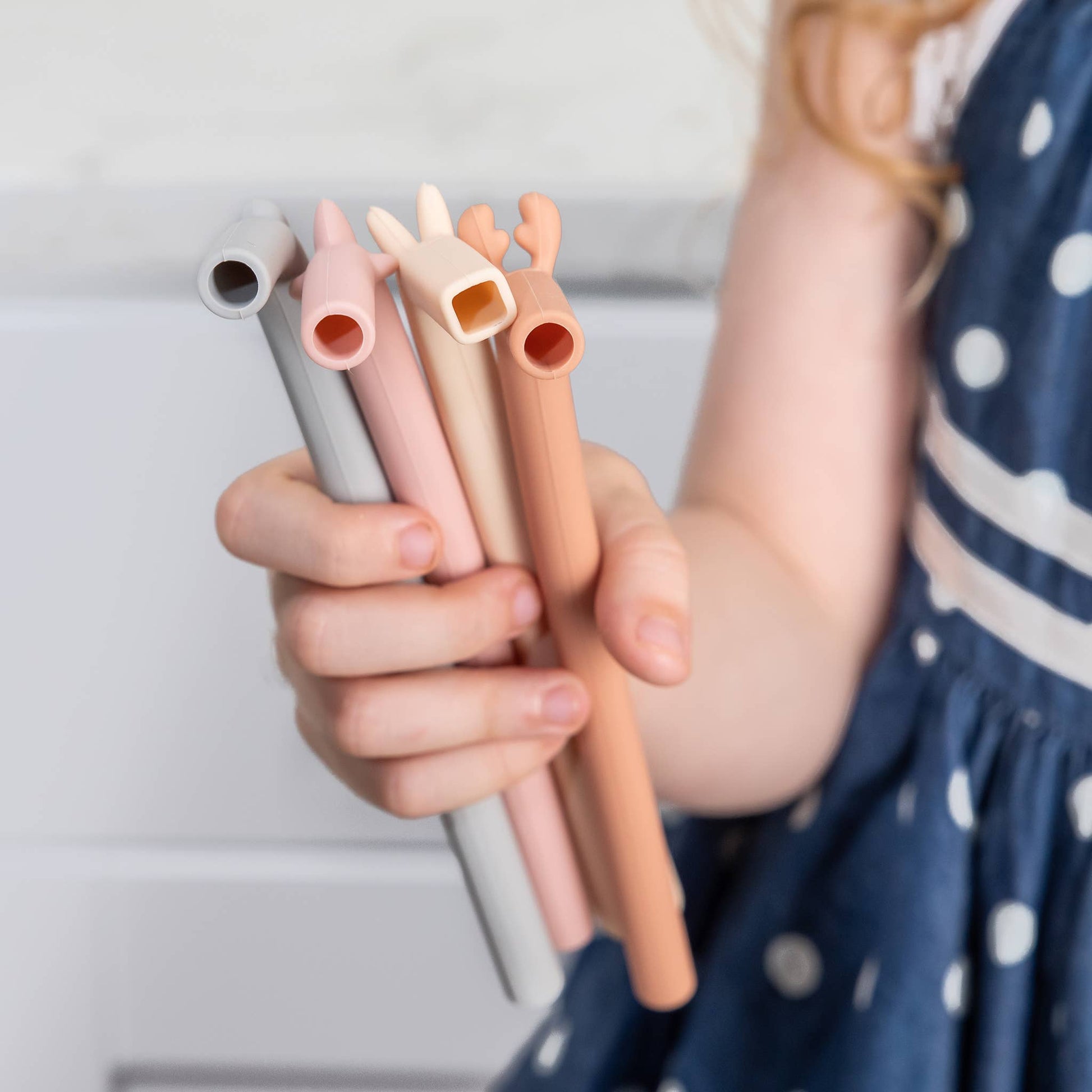 Each set includes four straws in a reusable pouch. Pink set: 1x giraffe (beige), 1x dolphin (pink), 1x dinosaur (gray), and 1x deer (clay).
