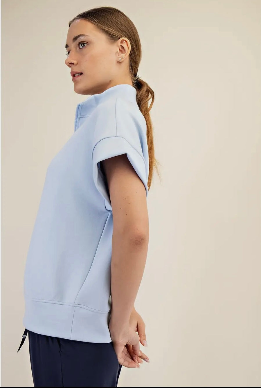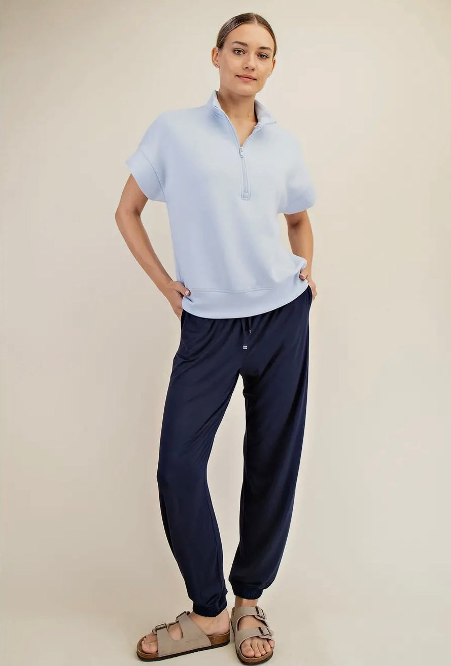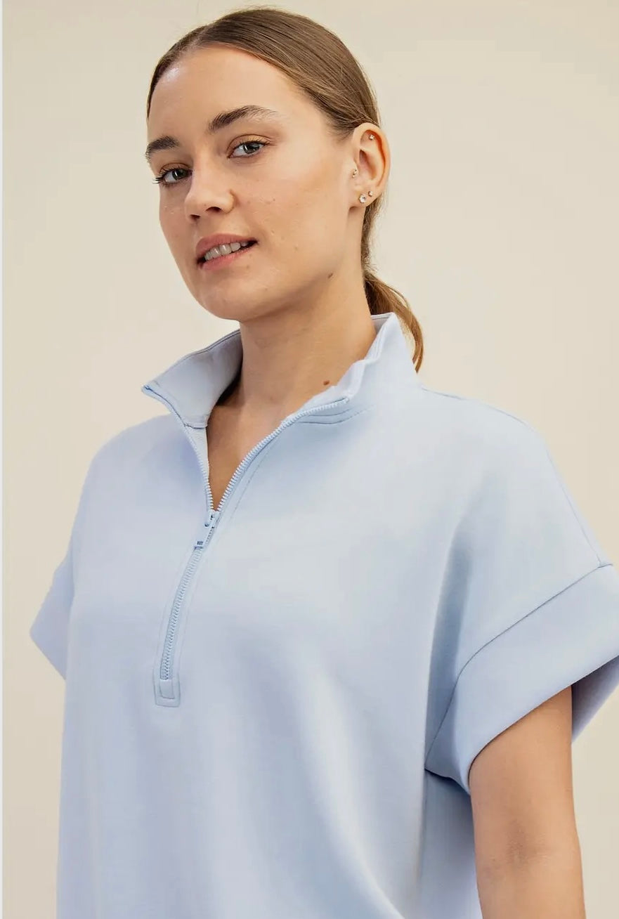 A short sleeve top made from luxurious, silky-smooth fabric, featuring a stylish quarter zip closure. Soft and refined, it adds an elevated touch to your everyday style.