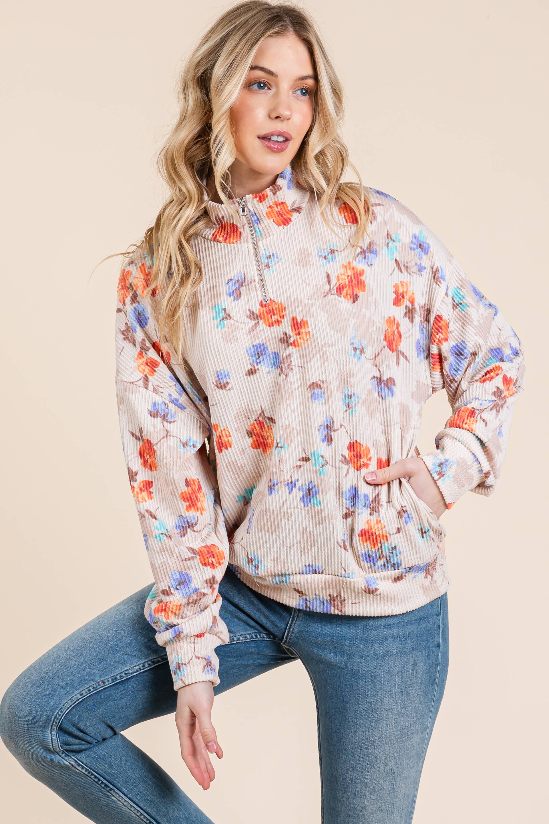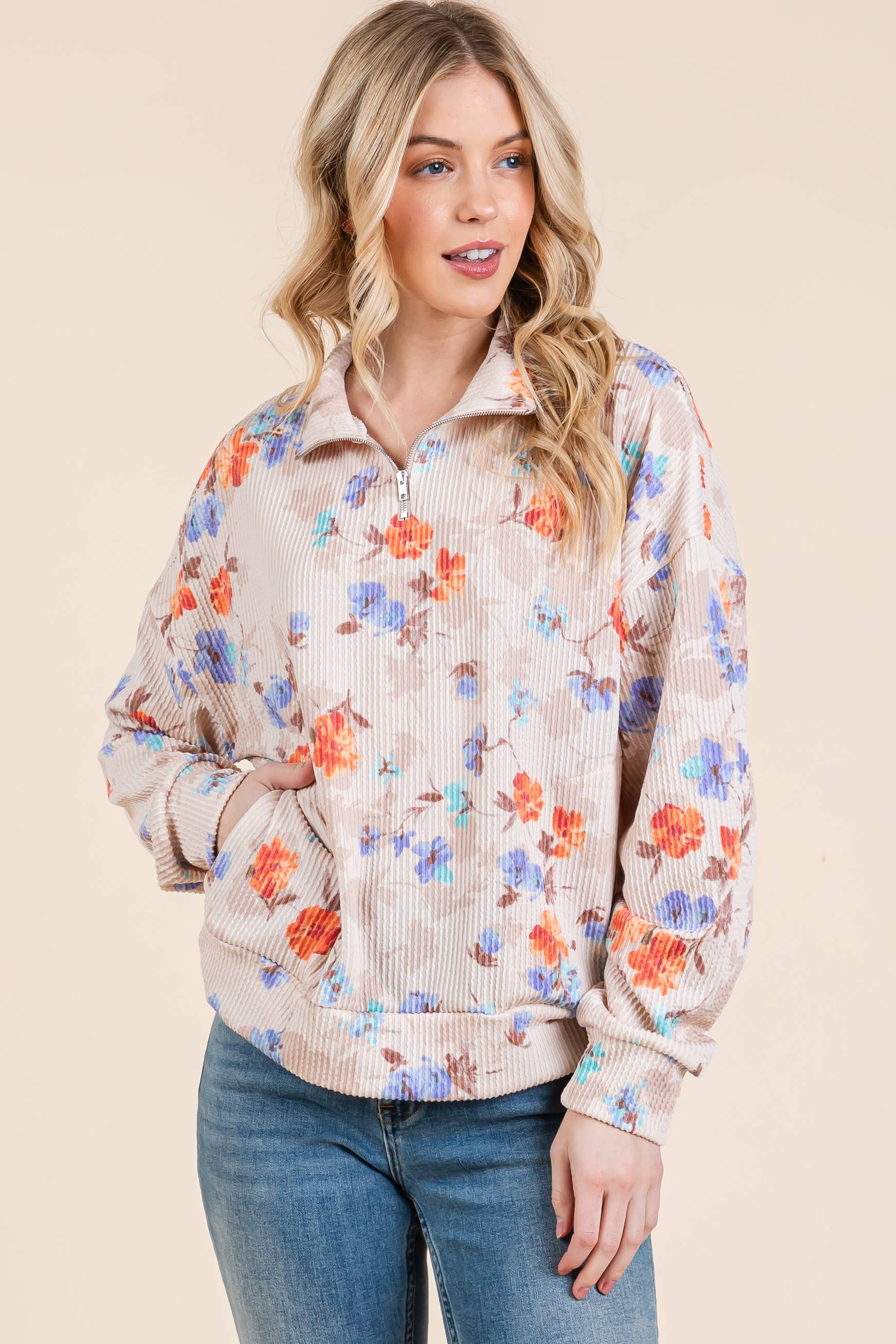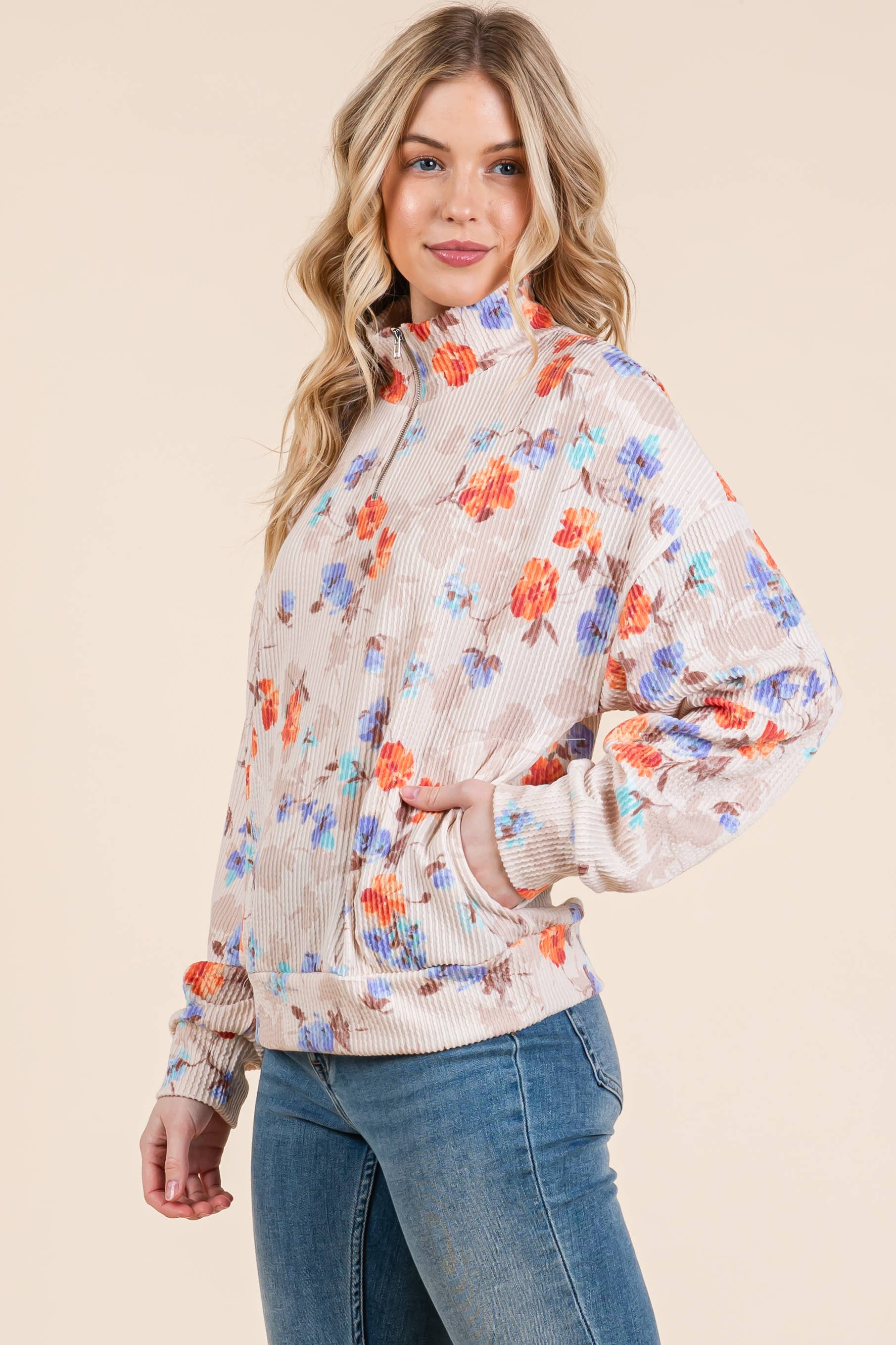 Soft textured knit fabric with a ribbed design for added warmth and style. Features a quarter-zip neckline with a silver zipper for adjustable styling. Long sleeves. Dropped shoulders for a casual, laid-back vibe. A front pocket for added functionality and a relaxed aesthetic.