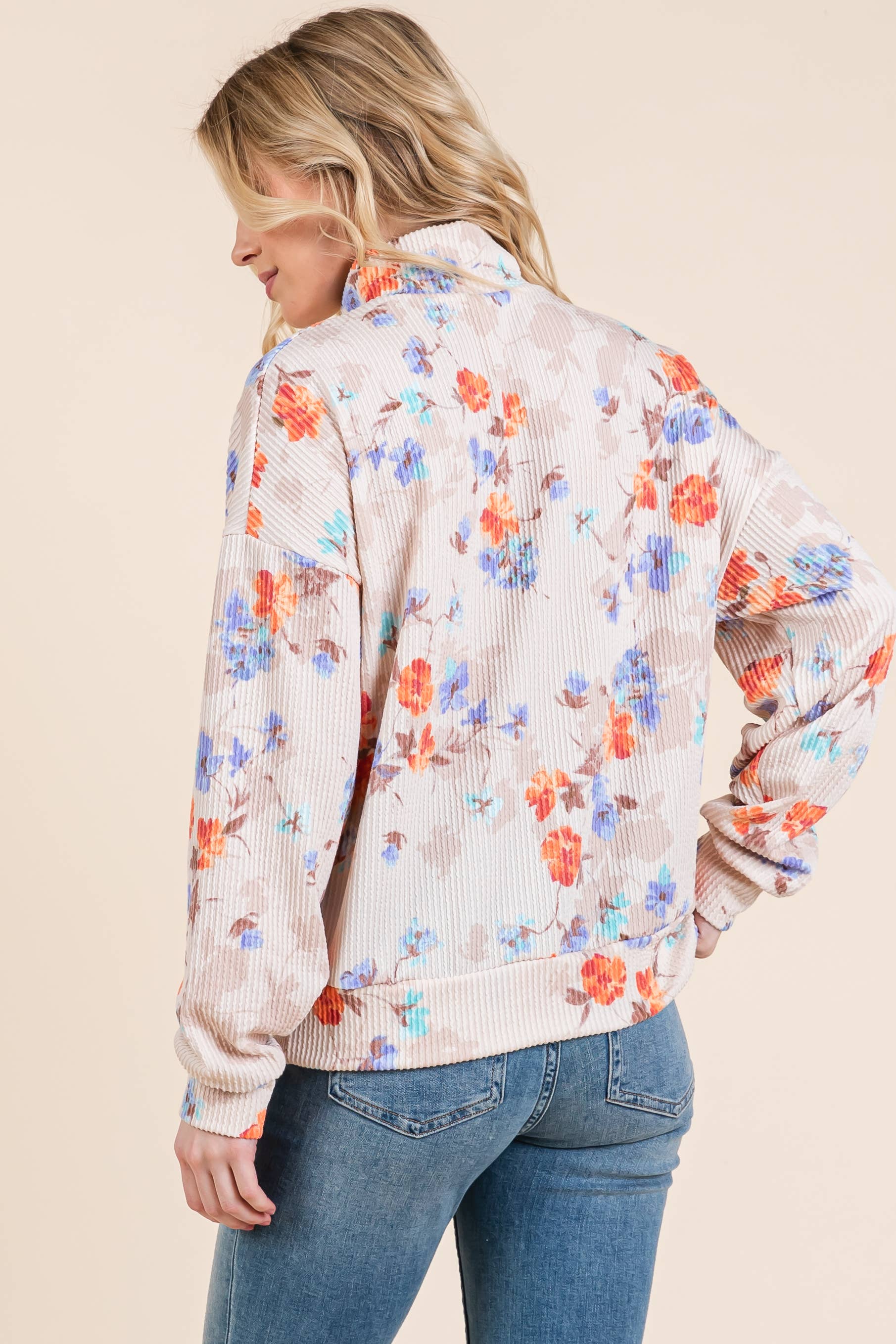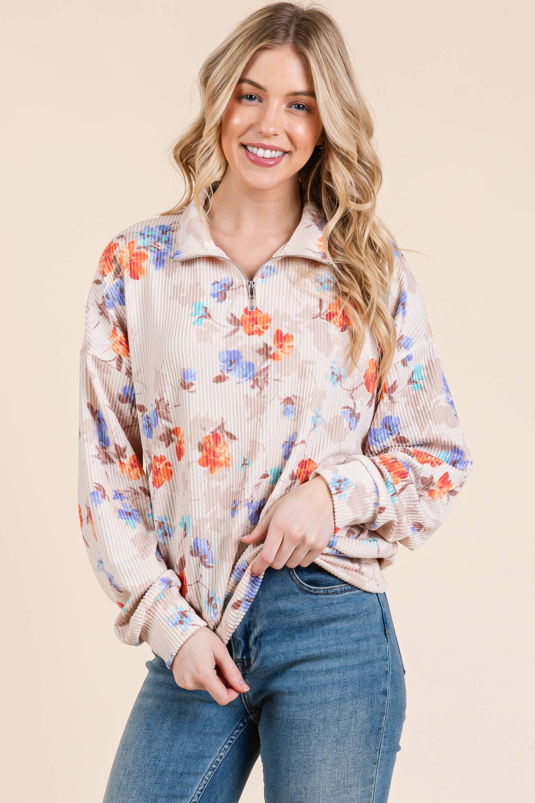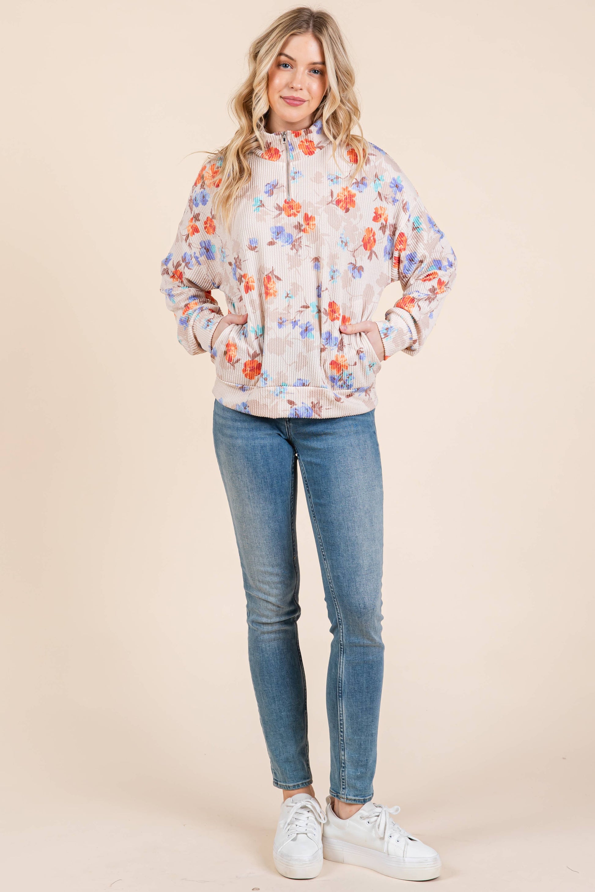 Soft textured knit fabric with a ribbed design for added warmth and style. Features a quarter-zip neckline with a silver zipper for adjustable styling. Long sleeves. Dropped shoulders for a casual, laid-back vibe. A front pocket for added functionality and a relaxed aesthetic.