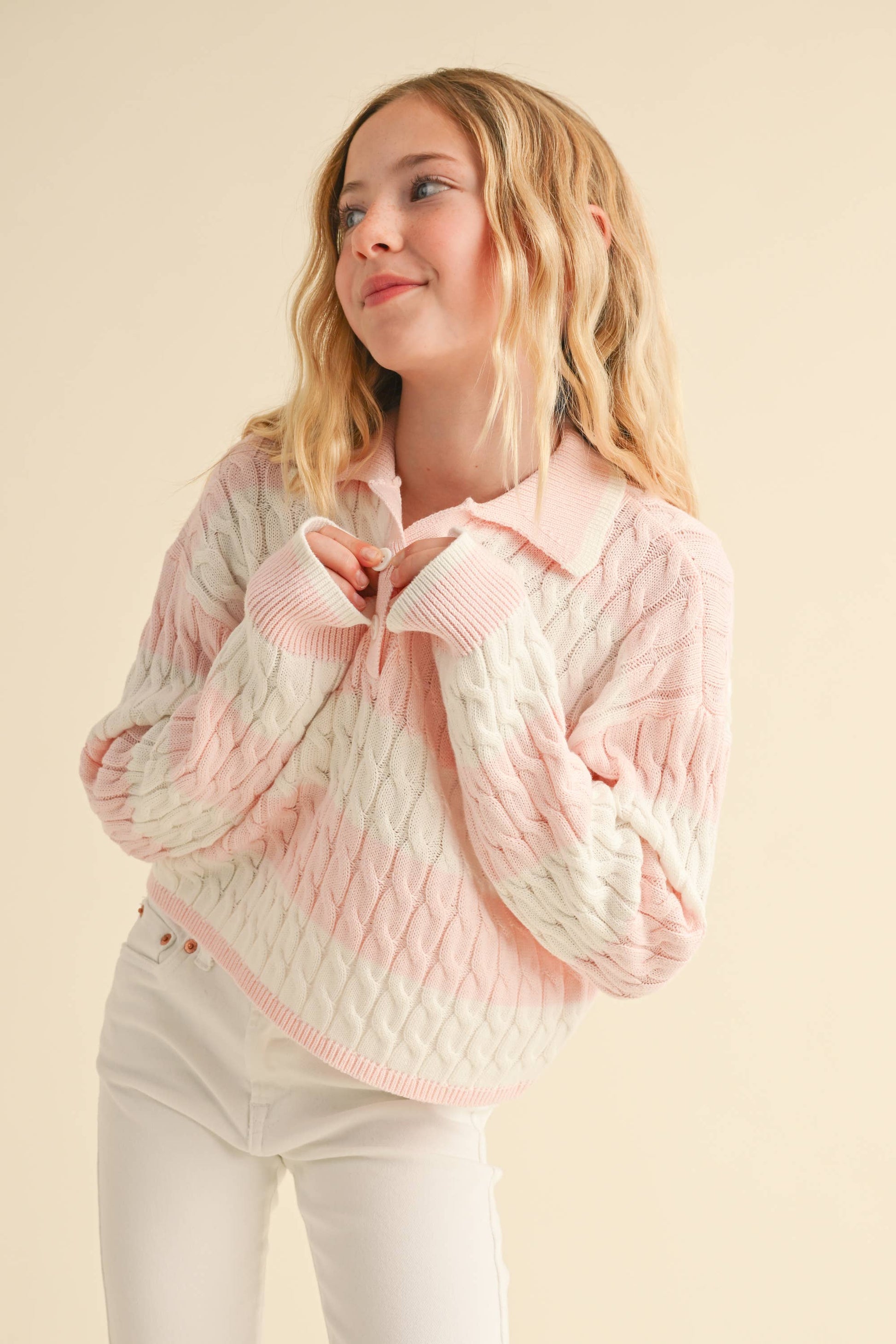 Knitted Long Sleeve Baxter Stripes Polo in Cable Knit