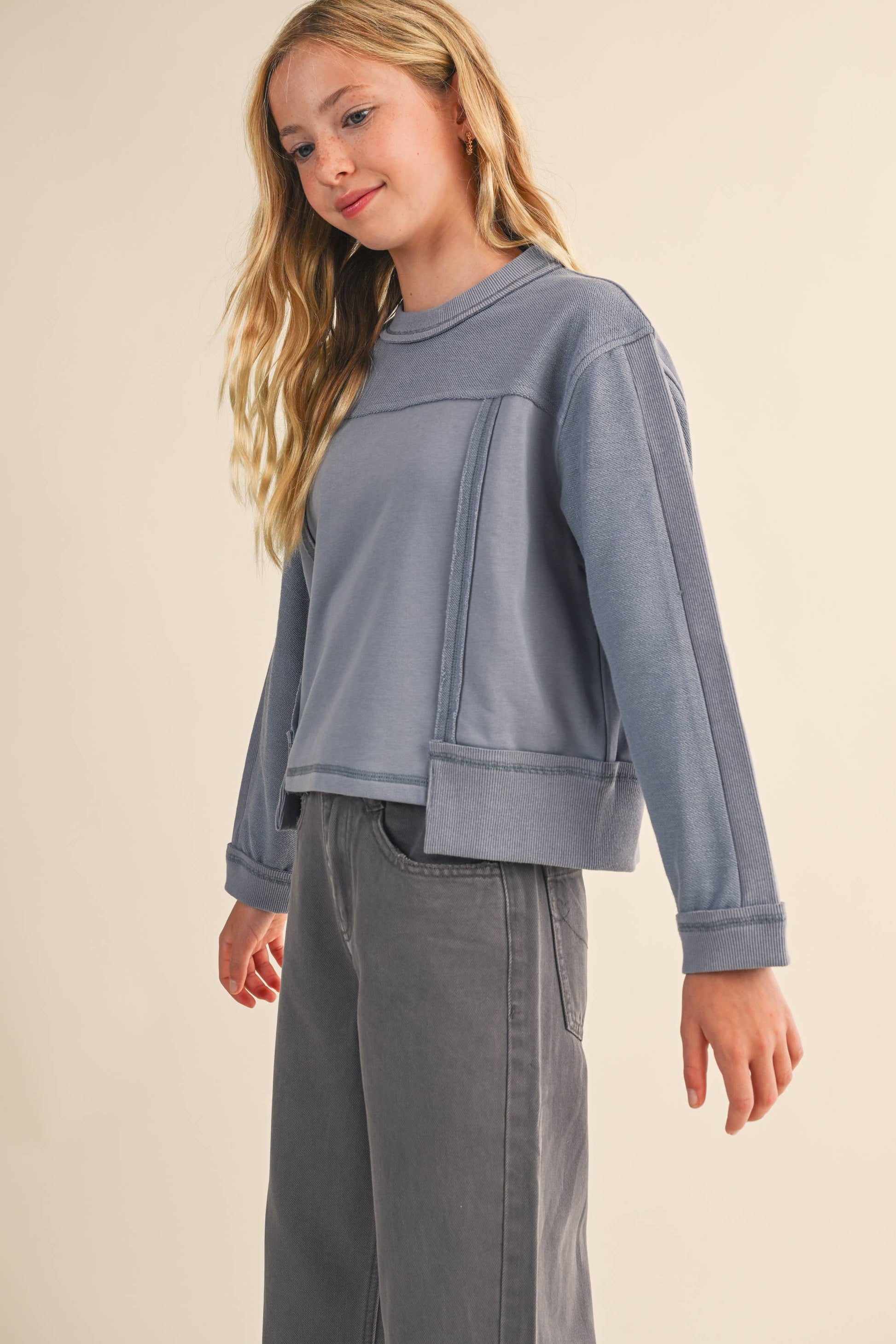 Stay effortlessly cool and comfortable in this dusty blue cropped sweatshirt, a modern twist on a casual classic. Crafted from soft, mid-weight cotton-blend fabric, it features textured ribbed panels along the sleeves and shoulders for added structure and dimension.