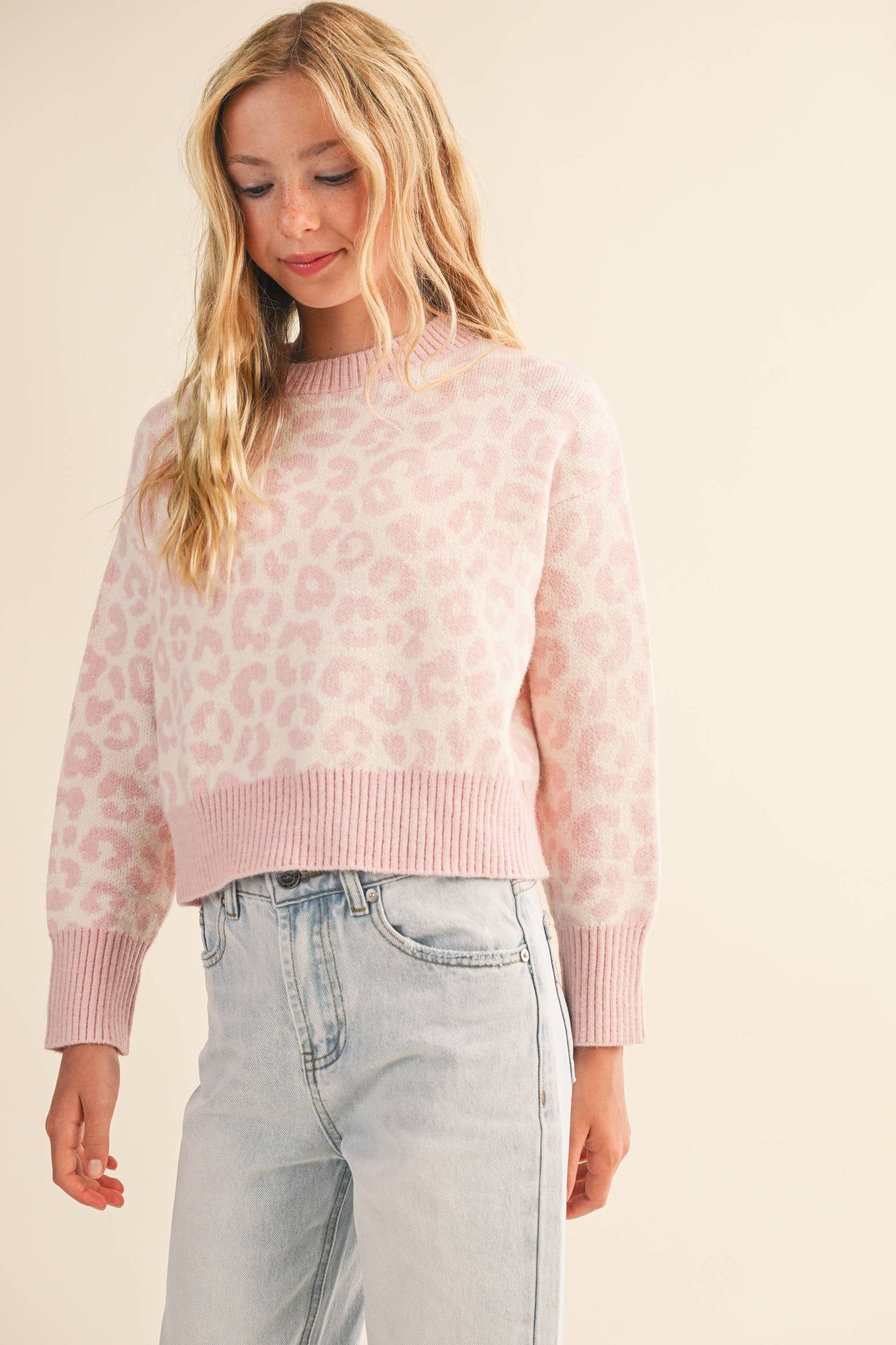 Make a bold yet playful statement with this cozy pink leopard print sweater. Featuring an all-over tonal animal print in soft blush and baby pink hues, this sweater blends trend-right style with everyday comfort. The relaxed fit and ribbed trims at the neck, cuffs, and hem offer a snug yet flexible wear, perfect for school, playdates, or weekend adventures. Soft to the touch and full of personality, it's a must-have piece for the wild-at-heart fashionista.