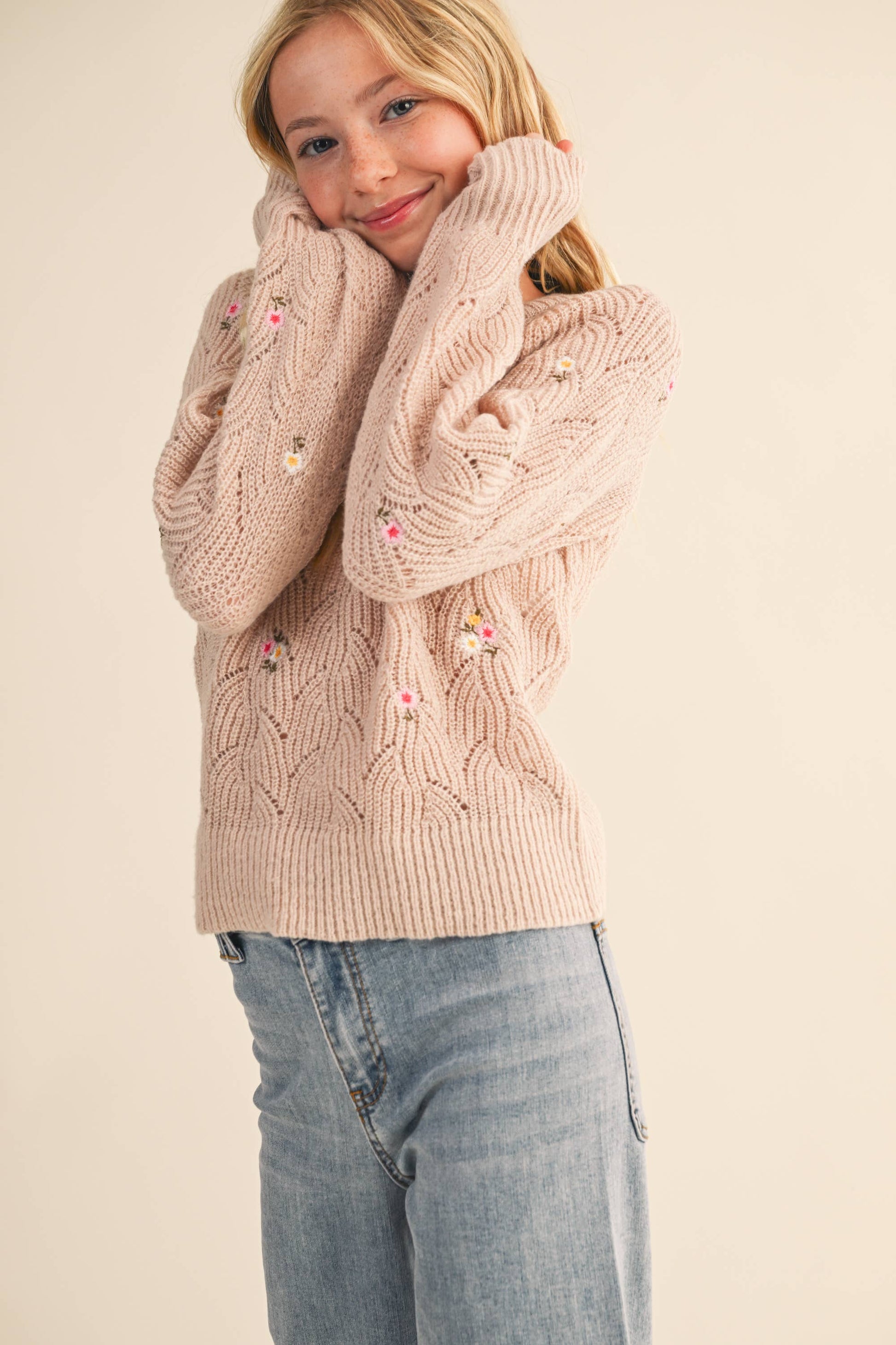 Sweet and sophisticated, this embroidered floral sweater is a charming addition to her fall and winter wardrobe. Made in a warm natural beige hue, the sweater features a delicate pointelle knit pattern with playful texture and breathability. Scattered with dainty floral embroidery in soft pink and white, it brings a touch of whimsy and elegance to any outfit.